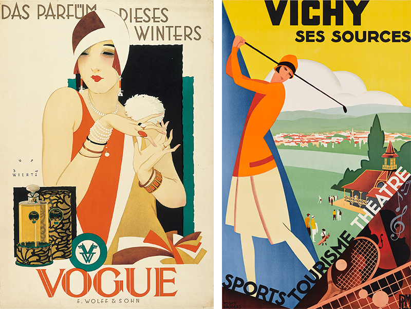 (左) ユップ・ヴィールツ 《ヴォーグ、今年の冬の香水はこれだ》 1925年 サントリーポスターコレクション(大阪中之島美術館寄託)